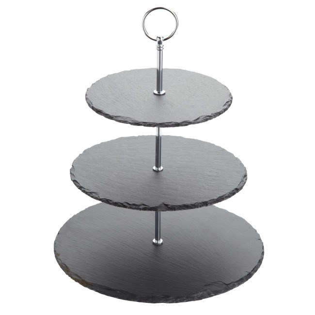 Břidlicový stylový etažér pro servírování koláčů, chlebíčků či jiného malého občerstvení. Tři samostatné přírodní břidlicové talíře jsou spojeny centrálním chromovým držadlem.